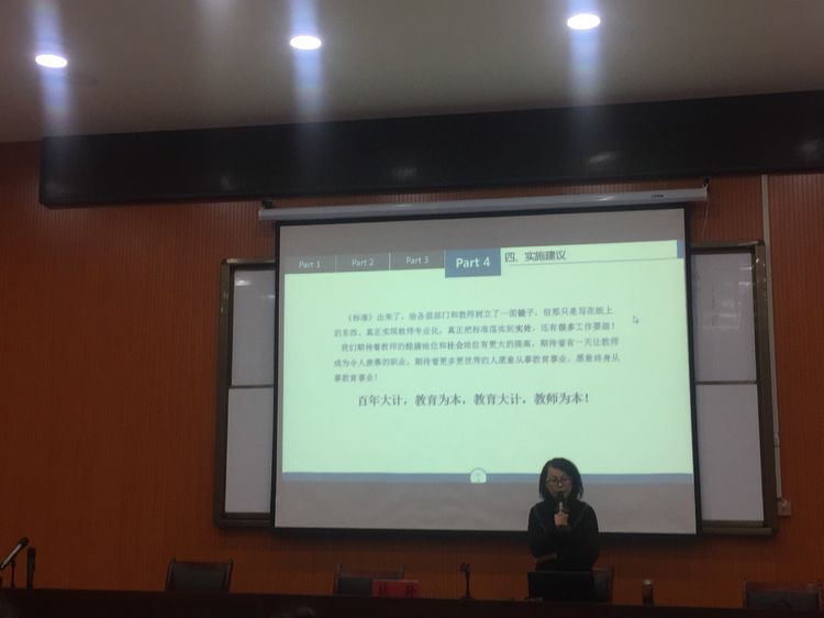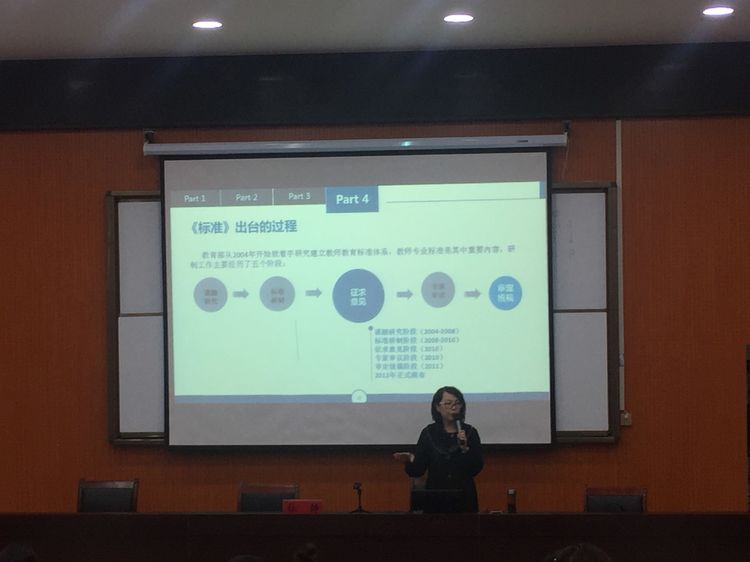接着杜教授从标准整体框架,基本理念,特点与内容,实施建议这四个方面为大家详细解读了教师专业标准的内容。