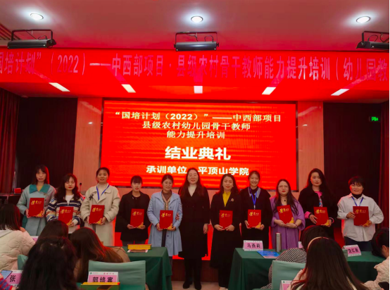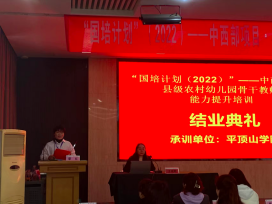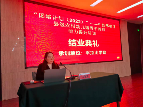 2023年3月20日,新葡萄官网AMG“国培计划”(2022)——中西部项目·县级农村骨干教师能力提升培训班(幼儿园教师)结业典礼在香山大酒店三楼会议室隆重举行。新葡萄官网AMG副院长王秋歌出席并主持结业典礼。班主任陈丽媛、彭鹏、申洪莹以及来自平顶山市和南阳市的99名学员参加本次典礼。