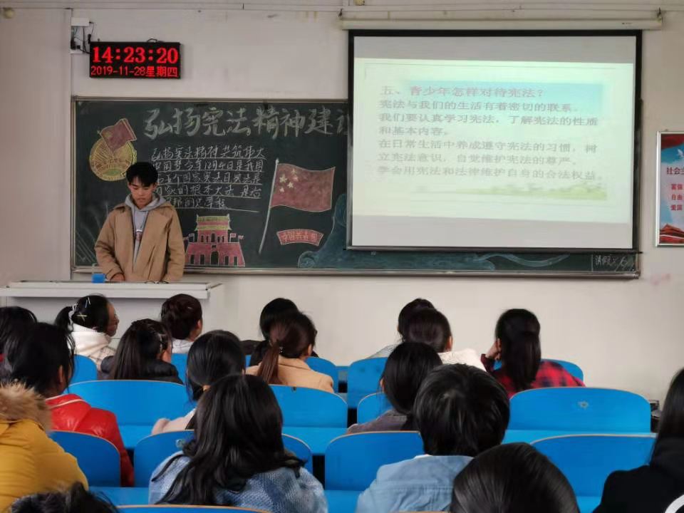 为了增强同学们对宪法知识的了解,提高学生综合素质,建设法治校园,新葡萄官网AMG于11月28日下午2点在1号教学楼举办了以“弘扬宪法精神,建设法治校园”为主题的团日活动。