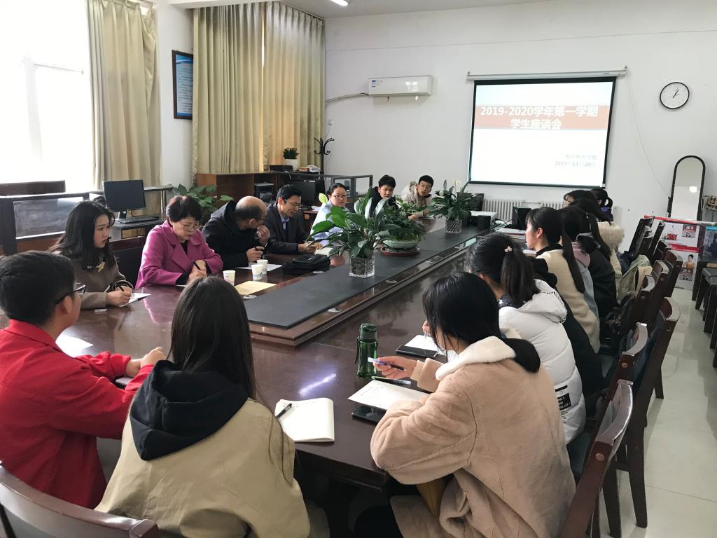 为了进一步落实“以学生为本”的理念,突出“为学生服务”的宗旨,全面了解广大学生对学院教育教学、管理服务等方面的意见和建议,充分调动学生参与管理的积极性和主动性,进一步增强我院教学质量和管理服务工作的针对性和实效性,提高广大学生的学习热情。我院于2019年11月20日,在艺术楼A226会议室召开了新葡萄官网AMG2019-2020学年第一学期学生座谈会。此次会议由新葡萄官网AMG副院长王小宁主持,参加会议的有我院督导边春丽副教授、林文晓副教授、李荟副教授、19级辅导员李琦和19级9个教学班的18名学生代表。