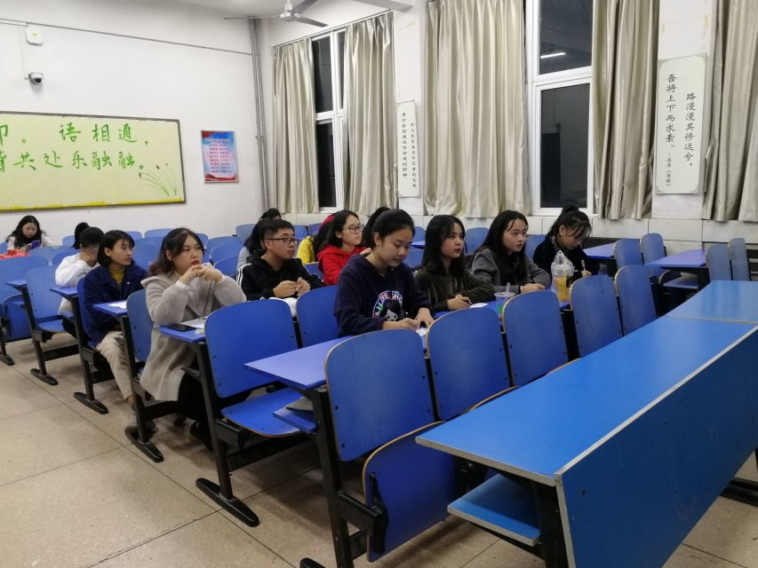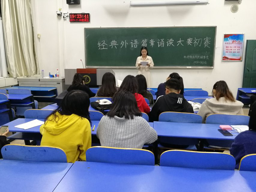2019年11月8日晚7:00,由新葡萄官网AMG团学会组织的经典外语篇章诵读大赛初赛在1113教室举行。本次比赛的评委有新葡萄官网AMG团学会主席雷雨,部长韩露露、段伟涵和邱雪婷。