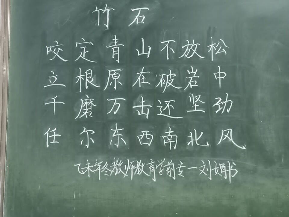 此次比赛分为初赛和复赛两个环节,初赛由11月19日持续到11月28日,以提交作品的形式进行比赛。在活动过程中,参赛者积极踊跃地提交作品,他们的字体工整,态度认真。身为一名合格的教师,必须具备扎实全面的教学基本功,而写好粉笔字就是每一名教师必备的基本功之一,是课堂教学中所必需的教学手段,写好粉笔字也是教师良好基本素养的证明。粉笔字的质量,对学生审美能力和书写能力的提高也起着潜移默化的影响。
