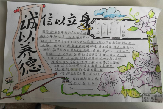 本次活动面向我院全体学生,参与人员围绕诚信这一主题制作手抄报。在活动初期,相关负责人进行了前期的宣传工作,吸引更多的学生参与活动。在活动过程中,同学们带着热情饱满的状态参加了本次活动,制作了精美的作品并及时提交至负责人处,在参与过程中也更加地深刻地意识到“诚信是为人之道,是立身处世之本”的道理。