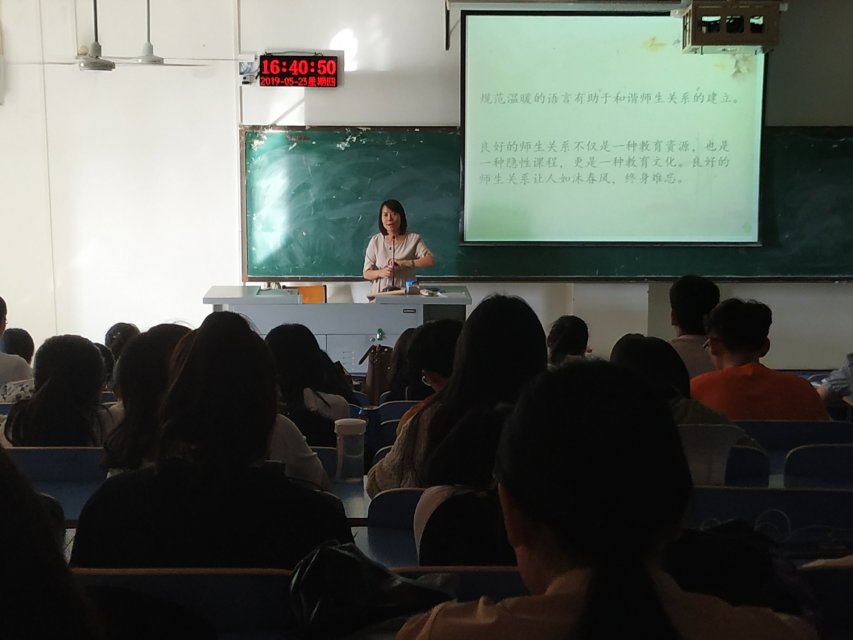 首先,兰老师跟在座的同学们进行交流,询问同学们对教师语言暴力的认知,调动同学们的求知欲。随即,兰老师从四个方面开始讲述关于教师语言的重点,兰老师就此介绍了教师是一个神圣的职业,它要求从业者必须具有高尚的道德情操和职业操守,而语言就是一位教师道德修养的最直接体现。语言暴力问题的研究十分必要且迫切。她指出教师采用侮辱谩骂、讽刺嘲笑、当中揭短、孤立冷落等手段对学生进行“心理惩罚”和“心灵施暴”的现象在呈逐渐上升趋势,呼吁教师注重语言的使用,要正确对学生进行鼓励、劝导而不是一味的谩骂、侮辱、不公平待遇。最后,兰老师让同学们观看了关于教师语言暴力的新闻视频,并采用提问的方式让同学们更深入了解教师语言的重要性。